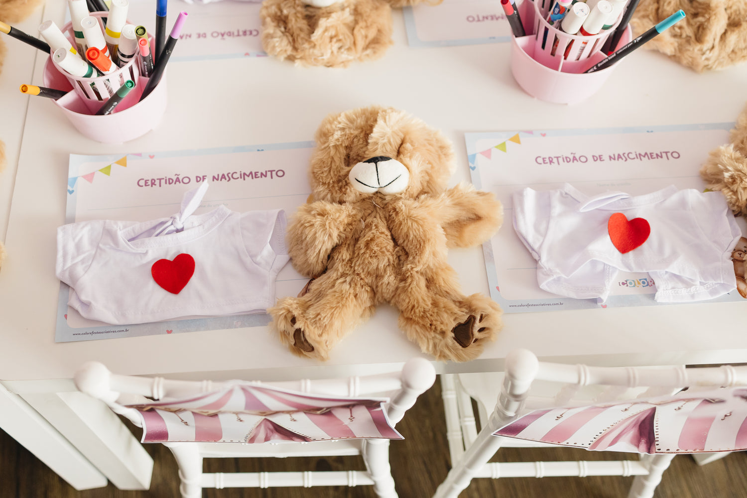 As crianças participam de todo processo para criar o seu novo amiguinho, desde colocar a espuma especial, o coraçãozinho até a customização da roupinha.